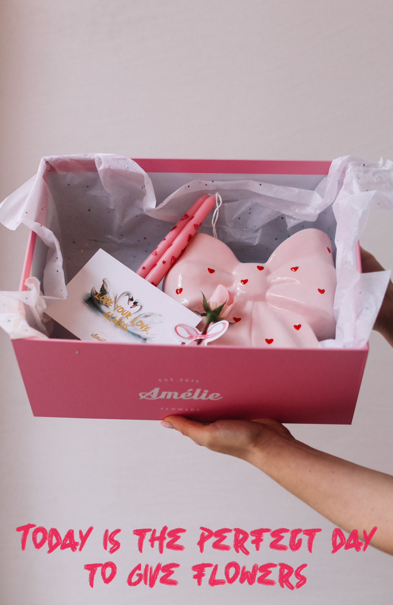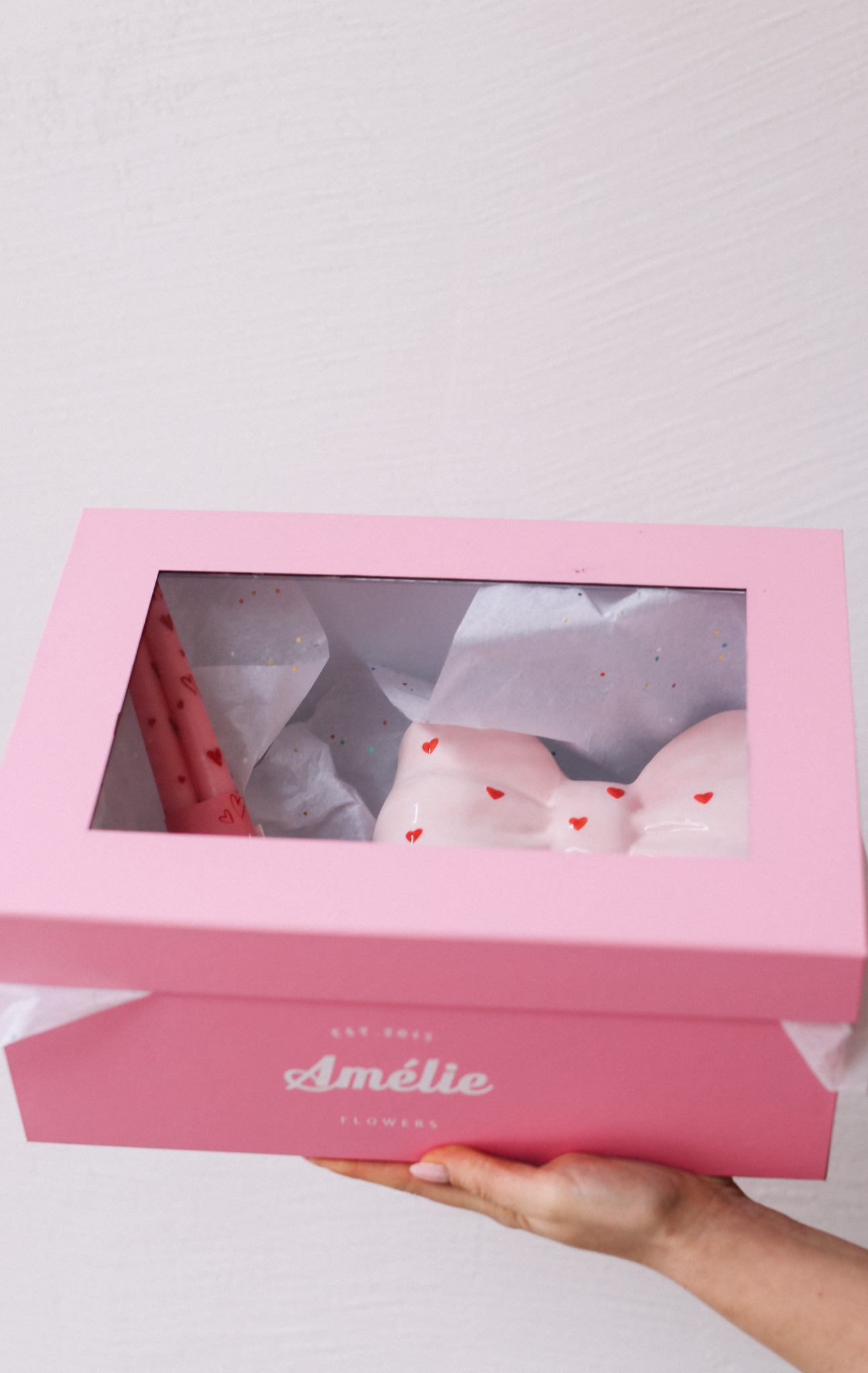 სასაჩუქრე ნაკრები ყუთით: ლარნაკი ბაფთის ფორმის, 2 სანთელი, მისალოცი ბარათი, ყვავილი ბაფთით
