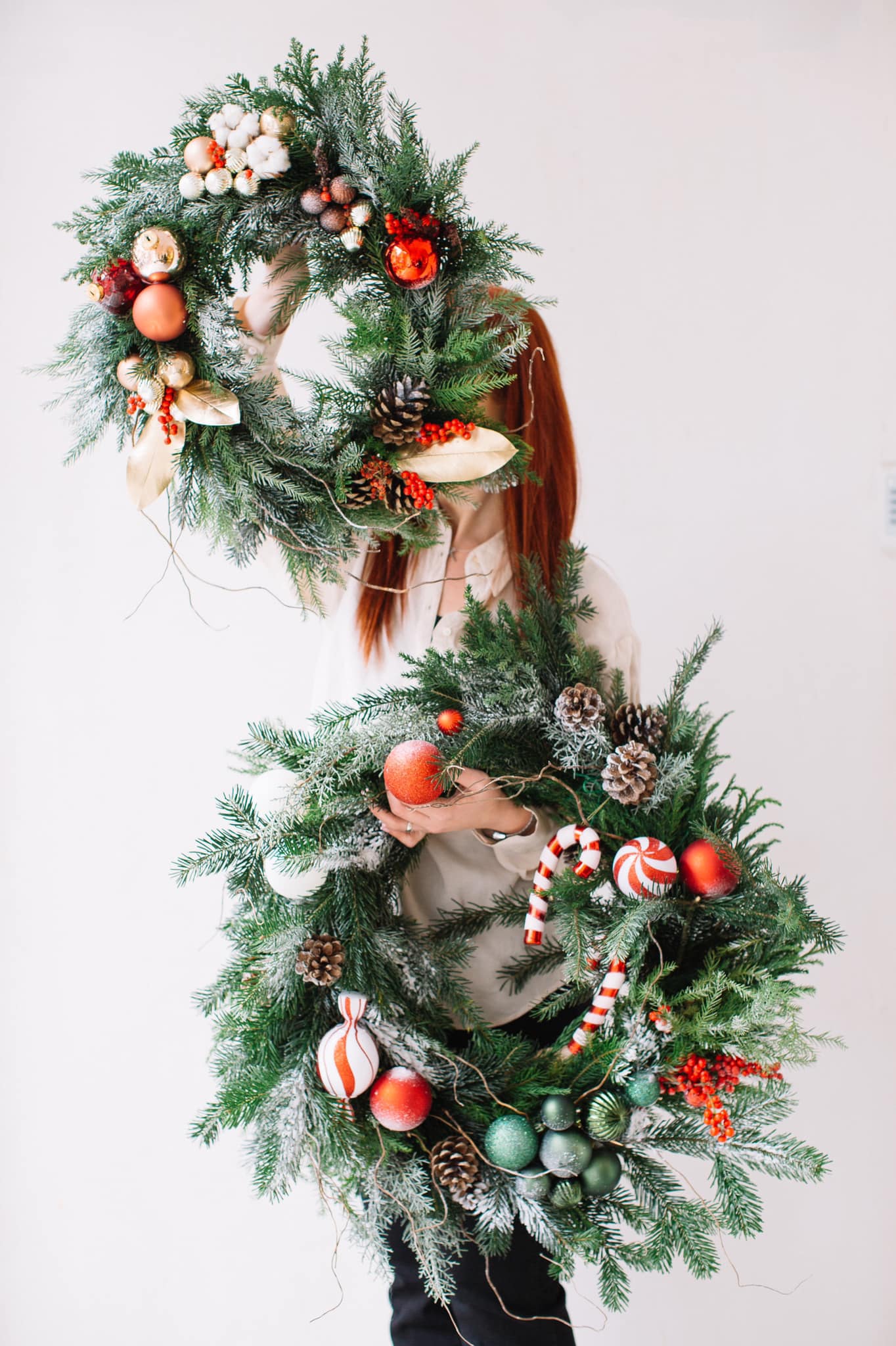 საახალწლო სათამაშოებით და ბაფთებით გაფორმებული ნაძვის ცოცხალი გირლანდა
